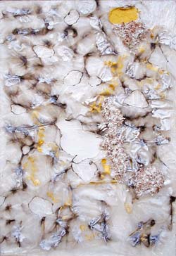 Bianco e plastica, anno 20076, tela cm. 70 x 100 - Tecnica: stoffa, colla, segatura, plastica combusta, oro acrilico e smalto.1991 Spoleto (PG), XXXIV Edizione del Festival dei Due Mondi. 1992 Assisi (PG), Sala delle Logge. Roma, via Sistina, Galleria d’arte La tartaruga.